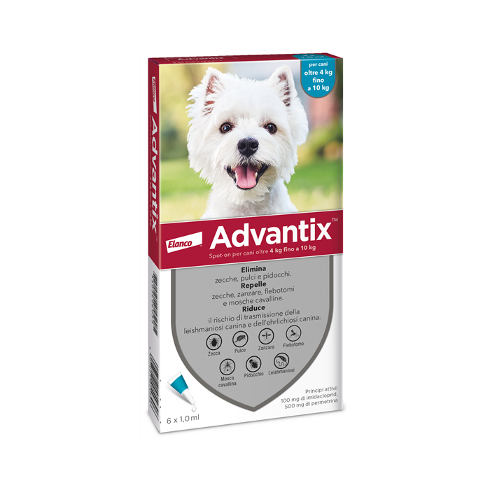 La dose minima raccomandata e': 10 mg/kg di peso corporeo (p.c.) di imidacloprid e 50 mg/kg di peso corporeo (p.c.) di permetrina. Schema posologico per Advantix Spot-on. Cani (kg peso corporeo): <= 4 kg; nome commerciale: advantix spot-on per cani fino a 4 kg; volume: 0,4 ml; imidacloprid: minimo 10 mg/kg peso corporeo; permetrina: minimo 50 mg/kg peso corporeo. Cani (kg peso corporeo): >4 kg <= 10 kg; nome commerciale: advantix spot-on per cani oltre 4 kg fino a 10 kg; volume: 1,0 ml; imidacloprid: 10 - 25 mg/kg peso corporeo; permetrina: 50 - 125 mg/kg peso corporeo. Cani (kg peso corporeo): >10 kg <= 25 kg; nome commerciale: advantix spot-on per cani oltre 10 kg fino a 25 kg; volume: 2,5 ml; imidacloprid: 10 - 25 mg/kg peso corporeo; permetrina: 50 - 125 mg/kg peso corporeo. Cani (kg peso corporeo): >25 kg <= 40 kg; nome commerciale: advantix spot-on per cani oltre 25 kg fino a 40 kg; volume: 4,0 ml; imidacloprid: 10 - 16 mg/kg peso corporeo; permetrina: 50 - 80 mg/kg peso corporeo. Per ridurre la reinfestazione dovuta alla comparsa di nuove pulci, si raccomanda di trattare tutti i cani presenti nell'ambiente domestico. Gli altri animali conviventi nello stesso ambiente domestico devono essere trattati con un prodotto idoneo. Per contribuire ulteriormente a ridurre la minaccia ambientale, si raccomanda l'uso aggiuntivo di un idoneo trattamento ambientale contro le pulci adulte ed i loro stadi in via di sviluppo. Il prodotto rimane efficace se l'animale si bagna. Si deve tuttavia evitare l'esposizione intensa e prolungata all'acqua. In caso di esposizione frequente all'acqua la persistenza dell'efficacia puo' essere ridotta. In questi casi non ripetere il trattamento piu' frequentemente di una volta alla settimana. Se per il cane e' richiesto uno shampoo, e' meglio farlo prima dell'applicazione di Advantix o almeno due settimane dopo l'applicazione, per ottimizzare l'efficacia del prodotto. In caso di infestazione da pidocchi, e' consigliata un'ulteriore visita veterinaria 30 giorni dopo il trattamento, perche' alcuni animali possono necessitare di un secondo trattamento. Per proteggere un cane per tutta la stagione dei flebotomi, il trattamento deve essere continuato in modo conforme per tutto il tempo. Solo per uso cutaneo. Applicare solamente su cute integra. Metodo di somministrazione per pipette con beccuccio applicatore corto: Togliere una pipetta dalla confezione. Tenendo la pipetta in posizione verticale, ruotare e togliere il cappuccio. Rigirare il cappuccio e rimettere l'estremita' opposta sulla pipetta. Ruotare il cappuccio per rompere il sigillo e quindi rimuovere il cappuccio dalla pipetta. Per cani di 10 kg di peso corporeo o inferiore: con il cane fermo sulle quattro zampe, ripartire il mantello tra le scapole fino a rendere visibile la cute. Appoggiare l'estremita' della pipetta sulla cute e spremere piu' volte in modo deciso fino a vuotare il contenuto direttamente sulla cute. Per cani oltre 10 kg di peso corporeo: con il cane fermo sulle quattro zampe, tutto il contenuto della pipetta di Advantix deve essere applicato equamente in quattro punti sulla sommita' del dorso a partire dalle spalle fino alla base della coda. In ciascun punto, ripartire il mantello fino a rendere visibile la cute. Appoggiare l'estremita' della pipetta sulla cute e spremere delicatamente per vuotare una parte della soluzione sulla cute. Non applicare in nessuno dei punti una quantita' eccessiva di soluzione che possa far si' che una parte di quest'ultima coli lungo i fianchi del cane. Metodo di somministrazione per pipette con beccuccio applicatore lungo: togliere una pipetta dalla confezione. Tenendo la pipetta in posizione verticale, ruotare e togliere il cappuccio. Per cani di 10 kg di peso corporeo o inferiore: con il cane fermo sulle quattro zampe, ripartire il mantello tra le scapole fino a rendere visibile la cute. Appoggiare l'estremita' della pipetta sulla cute e spremere piu' volte in modo deciso fino a vuotare il contenuto direttamente sulla cute. Per cani oltre 10 kg di peso corporeo: con il cane fermo sulle quattro zampe, tutto il contenuto della pipetta di Advantix deve essere applicato equamente in quattro punti sulla sommita' del dorso a partire dalle spalle fino alla base della coda. In ciascun punto, ripartire il mantello fino a rendere visibile la cute. Appoggiare l'estremita' della pipetta sulla cute e spremere delicatamente per vuotare una parte della soluzione sulla cute. Non applicare in nessuno dei punti una quantita' eccessiva di soluzione che possa far si' che una parte di quest'ultima coli lungo i fianchi del cane.