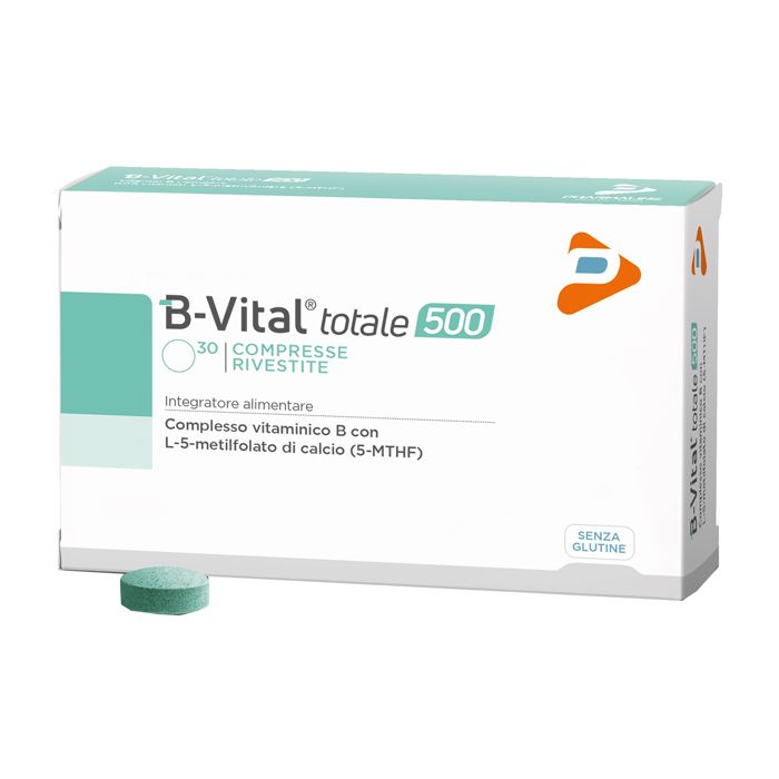 B-Vital totale 500 è costituito da una formulazione polivitaminica che comprende vitamine del gruppo B in dosi tra loro bilanciate e, in particolare, contiene 400 mcg di folato nella sua forma attivata (5-MTHF) e 500 mcg di vitamina B12.
