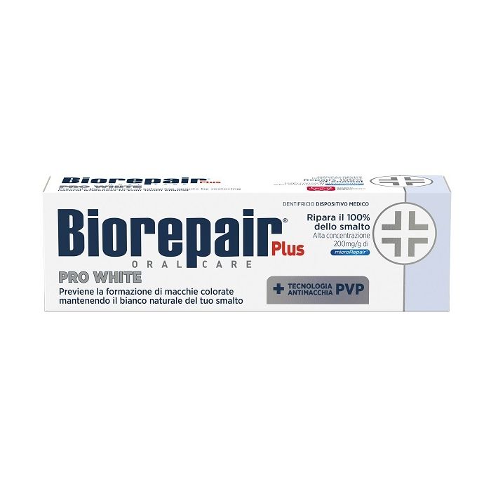 Biorepair Plus Pro White ripara la superficie dello smalto restituendo ai denti il loro naturale colore bianco.