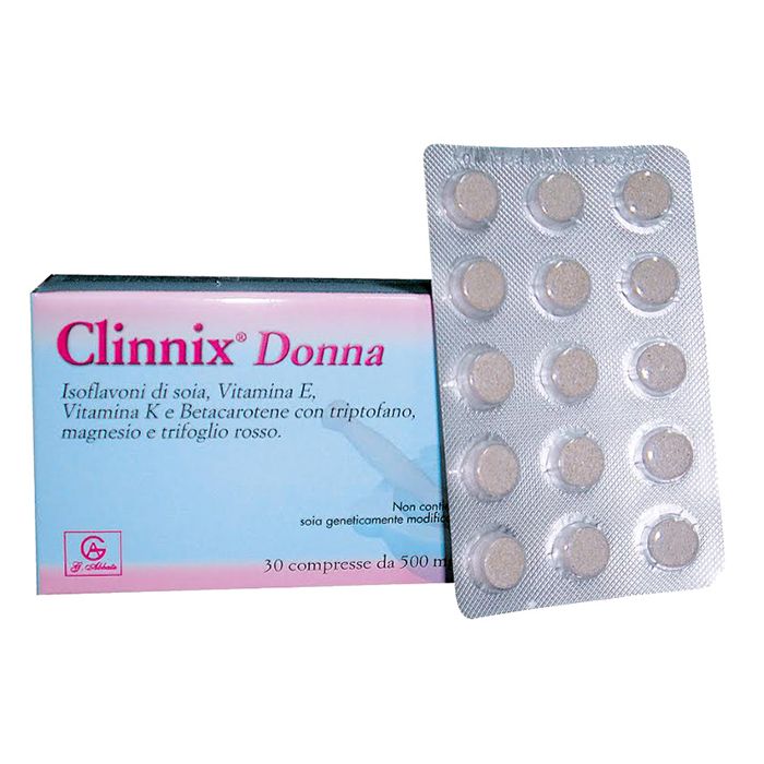 Clinderm Donna è un integratore alimentare a base di isoflavoni di soia, vitamina E, vitamina K e betacarotene con triptofano, magnesio e trifoglio rosso.