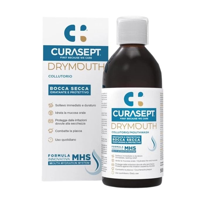 Collutorio. Indicato per chi soffre di bocca secca. Grazie alla formula arricchita con MHS (mouth hydration system), un mix equilibrato di sostanze idratanti, il collutorio curasept drymouth dona una prolungata sensazione di benessere a tutto il cavo orale, soprattutto in caso di secchezza. L'azione sinergica tra elementi già presenti nella naturale composizione della saliva e agenti antiplacca favorisce la protezione del cavo orale, riducendo il rischio di carie e stimolando l'idratazione delle mucose orali. - sollievo immediato e duraturo.