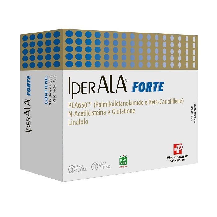 Iperala forte è un integratore alimentare a base di PEA650, associazione di Palmitoiletanolamide (PEA) e beta-cariofillene (da estratto di pepe nero), N-acetilcisteina, glutatione, vitamina C e linalolo (da estratto di coriandolo), utile in caso di ridotto apporto con la dieta o aumentato fabbisogno di tali nutrienti. Il coriandolo ha azione antiossidante. La vitamina C contribuisce al normale funzionamento del sistema nervoso, alla riduzione della stanchezza e dell’affaticamento e al normale metabolismo energetico.