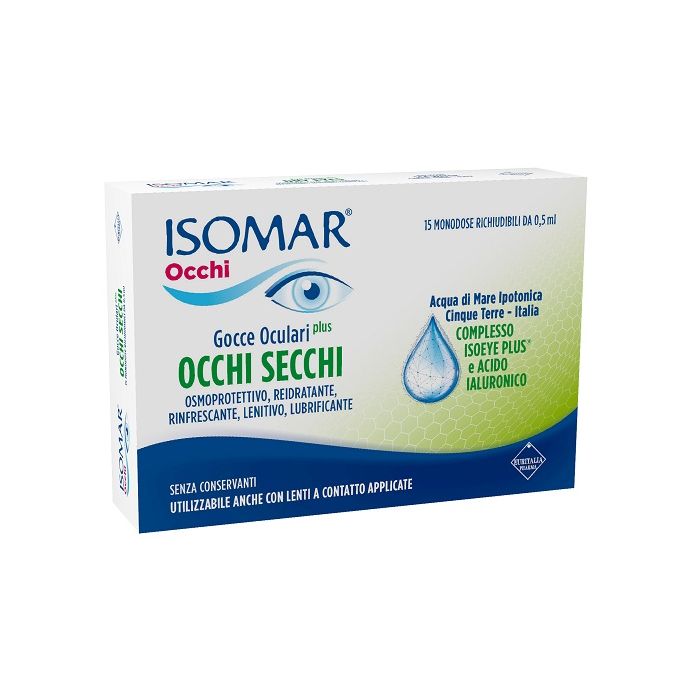 Particolarmente indicato per il trattamento dell'occhio secco, dona sollievo dalle sensazioni di bruciore ed irritazione causate dalla secchezza oculare. Isomar Occhi Plus, grazie alla sua formulazione, contribuisce a lenire la sintomatologia dell'occhio secco. Tramite le seguenti azioni: