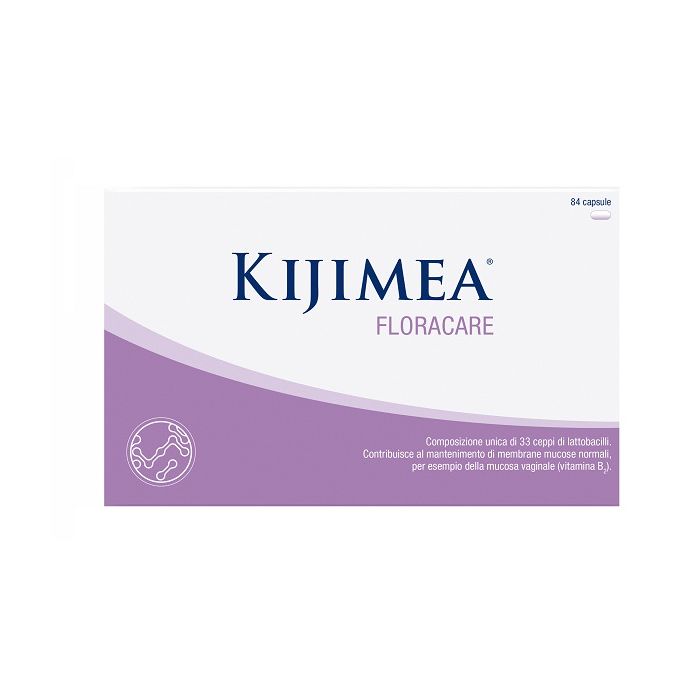 Integratore alimentare contenente una composizione di 33 ceppi di lattobacilli selezionati. Kijimea FloraCare contiene inoltre le vitamine B3, B7 e B2, che contribuiscono al mantenimento di membrane mucose normali (per esempio della mucosa vaginale).