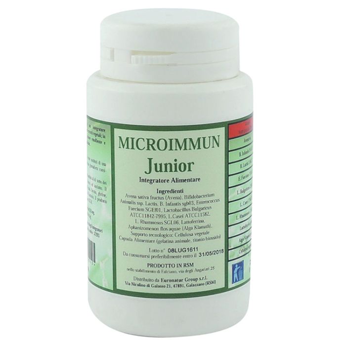 Integratore alimentare probiotico a base di lactobacillus bulgaricus, lactobacillus casei, lactobacillus rhamnosus, bifidobacterium infantis, bifidobacterium lactis, enterococcus faecium, lattoferrina, alga Klamath, Avena (ricca in beta-glucani), in grado di favorire lo sviluppo della flora batterica intestinale e delle difese organiche.