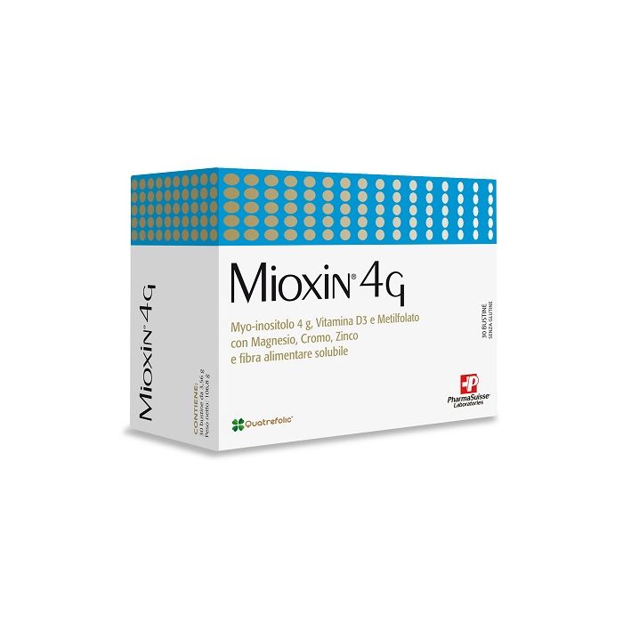 Integratore alimentare a base di Myo-inositolo, vitamina D3, metilfolato, magnesio, zinco e cromo, con fibra alimentare solubile, utile in caso di ridotto apporto con la dieta o aumentato fabbisogno di tali nutrienti. Il magnesio contribuisce al normale metabolismo energetico e alla normale funzione muscolare. Lo zinco contribuisce al normale metabolismo dei carboidrati. Il cromo contribuisce al normale metabolismo dei macronutrienti e al mantenimento di livelli normali di glucosio nel sangue. La vitamina D e l'acido folico intervengono nel processo di divisione delle cellule. L'assunzione integrativa di Acido folico aumenta lo stato del folato materno. Un basso stato del folato materno è un fattore di rischio per lo sviluppo di difetti del tubo neurale nel feto. Mioxin 4G contiene Quatrefolic, Acido folico in forma biologicamente attiva (Metilfolato).