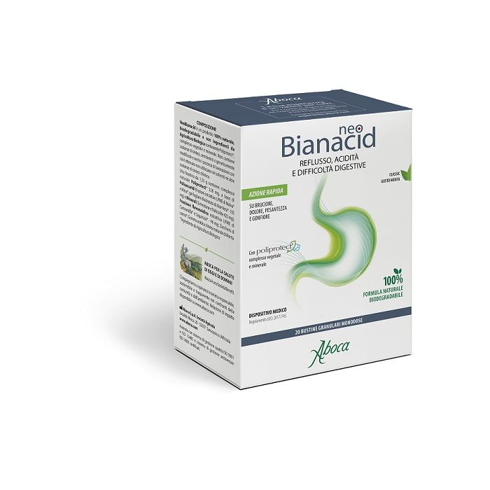 Indicato per il trattamento del reflusso gastroesofageo e del dolore di stomaco (dispepsia dolorosa), caratterizzati da rigurgito acido, bruciore, dolore, tosse irritativa, disfonia. NeoBianacid è indicato anche nel trattamento dei sintomi associati a difficoltà di digestione (dispepsia non dolorosa), quali acidità, pesantezza e gonfiore dopo i pasti, sia ricorrenti che in caso di eccessi alimentari. NeoBianacid può essere utile in prevenzione, nelle situazioni che provocano irritazione della mucosa (ad esempio assunzione di farmaci antinfiammatori o periodi di stress psico-fisico). Il prodotto è adatto anche all’uso in gravidanza, durante l’allattamento e nei bambini sopra i 6 anni.