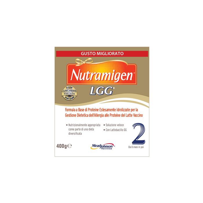 Formula nutrizionalmente completa a base di caseina estesamente idrolizzata, realizzata per soddisfare il fabbisogno giornaliero del lattante con allergia alle proteine del latte vaccino. È la prima formula per lattanti allergici con i livelli di DHA (Omega 3) raccomandati, che favoriscono il normale sviluppo visivo. Nutramigen 2 contiene il probiotico LGG, una combinazione che favorisce la gestione dietetica dell'allergia al latte vaccino e che aiuta a ritornare più velocemente ad una dieta normale. La formula estesamente idrolizzata ha un sapore ed un odore diverso dalle formule standard per l'infanzia; occorre quindi far abituare il lattante.
