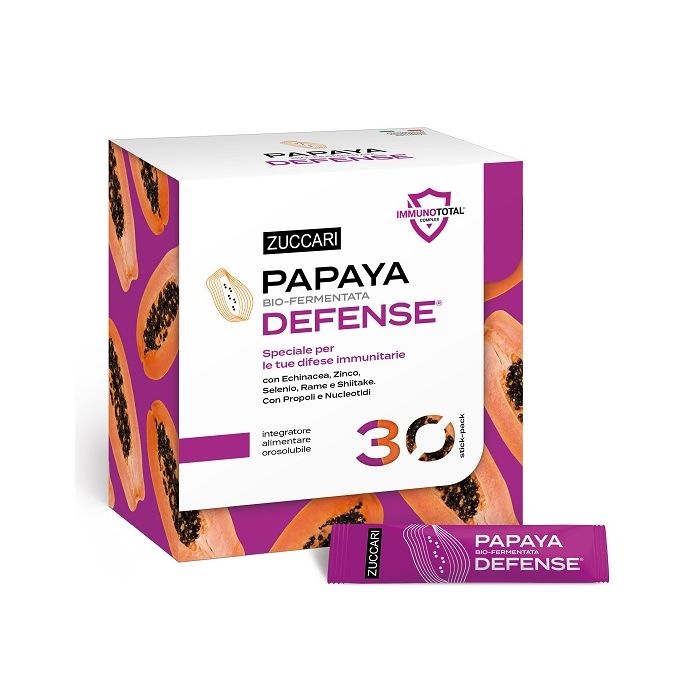 Integratore alimentare orosolubile costituito da polpa di carica papaya bio-fermentata, atomizzata e granulata, arricchita con Immunototal Complex. Immunototal Complex è un mix di attivi selezionati per il loro apporto specifico. Tre varietà di echinacea, zinco, selenio, rame e shiitake contribuiscono al normale funzionamento del sistema immunitario. Completano la formula vitamina B12 per il metabolismo energetico, propoli e nucleotidi.