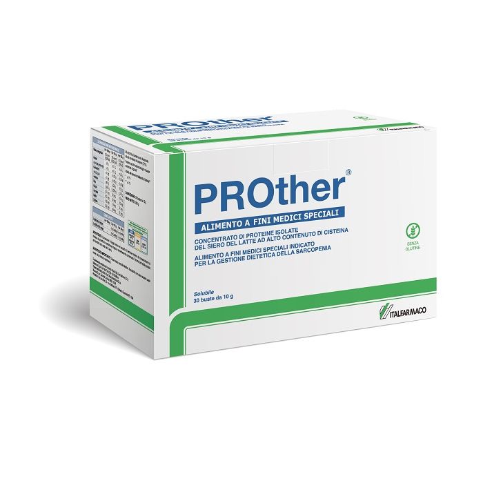 Alimento a fini medici speciali iperproteico, costituito da proteine del siero di latte non denaturate ad alto valore biologico (DIF16WPI), indicato per la gestione dietetica di soggetti con perdita di massa muscolare scheletrica (sarcopenia) dovuta a malnutrizione proteica, invecchiamento e/o malattie croniche. La sarcopenia rende necessaria l’assunzione di elevate quantità di proteine, tuttavia, le condizioni in cui si presenta sono accompagnate da inappetenza, dif ficoltà di alimentazione e/o malnutrizione. L’isolato di sieroproteine è particolarmente appropriato in questo contesto per la elevata concentrazione (≥ 92,5%), alto valore biologico delle proteine apportate e loro digeribilità, che ottimizzano l’assorbimento, favorendo così un aumentato apporto proteico alla dieta. Le proteine non denaturate rappresentano una fonte concentrata di cisteina biodisponibile, precursore e nutriente condizionante della sintesi di glutatione, la cui concentrazione cellulare si riduce in condizioni di carenza proteica. Essendo il glutatione coinvolto nella sintesi proteica, un maggior apporto del suo precursore risulta particolarmente opportuno nella gestione dietetica della sarcopenia. PROther è indicato per la nutrizione orale ed enterale con SNG e/o PEG di pazienti con problemi di masticazione e deglutizione.