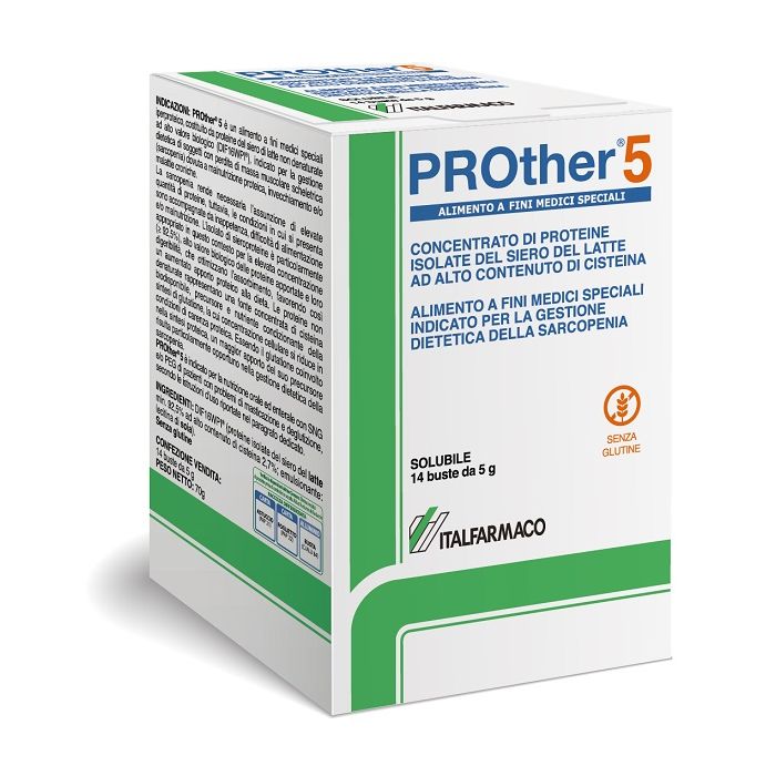 Alimento a fini medici speciali iperproteico, costituito da proteine del siero di latte non denaturate ad alto valore biologico (DIF16WPI), indicato per la gestione dietetica di soggetti con perdita di massa muscolare scheletrica (sarcopenia) dovuta a malnutrizione proteica, invecchiamento e/o malattie croniche. La sarcopenia rende necessaria l’assunzione di elevate quantità di proteine, tuttavia, le condizioni in cui si presenta sono accompagnate da inappetenza, dif ficoltà di alimentazione e/o malnutrizione. L’isolato di sieroproteine è particolarmente appropriato in questo contesto per la elevata concentrazione (≥ 92,5%), alto valore biologico delle proteine apportate e loro digeribilità, che ottimizzano l’assorbimento, favorendo così un aumentato apporto proteico alla dieta. Le proteine non denaturate rappresentano una fonte concentrata di cisteina biodisponibile, precursore e nutriente condizionante della sintesi di glutatione, la cui concentrazione cellulare si riduce in condizioni di carenza proteica. Essendo il glutatione coinvolto nella sintesi proteica, un maggior apporto del suo precursore risulta particolarmente opportuno nella gestione dietetica della sarcopenia. PROther 5 è indicato per la nutrizione orale ed enterale con SNG e/o PEG di pazienti con problemi di masticazione e deglutizione.