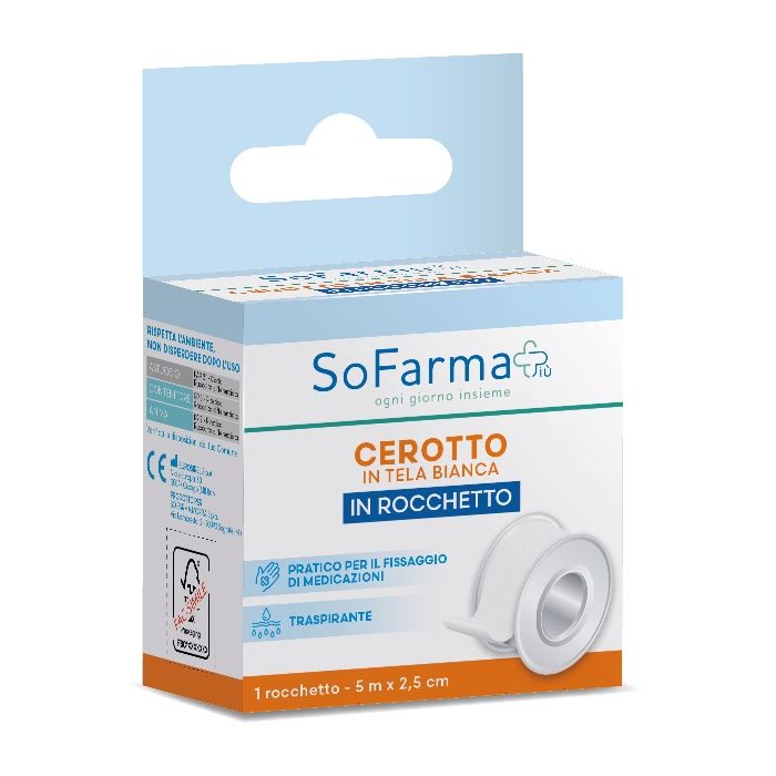 Rocchetto in tela bianca ritagliabile su misura, pratico per il fissaggio di medicazioni.
