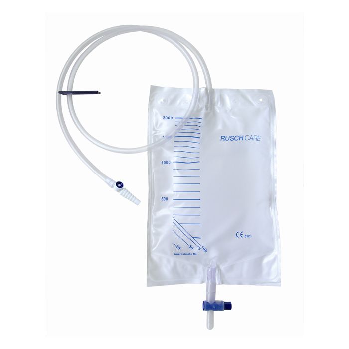 Sacca di raccolta per urina dotata di raccordo universale cono catetere, con valvola di non ritorno (antireflusso) e rubinetto di scarico T-Tap sul lato inferiore per svuotamento dell’urina (riutilizzabile), situ di prelievo con siringa senza ago; morsetto di chiusura del tubo e indicazione del volume prestampato.