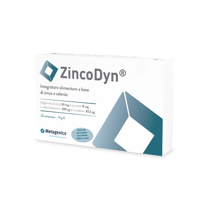ZincoDyn è un integratore alimentare per adulti contenente zinco che contribuisce al mantenimento di unghie, capelli, pelle e ossa normali. ZincoDyn contribuisce al normale funzionamento della tiroide. Lo zinco concorre alla normale funzione cognitiva e alle normali fertilità e funzione riproduttiva. Inoltre, lo zinco contribuisce alla funzione fisiologica del sistema immunitario e alla protezione delle cellule dallo stress ossidativo. La fonte di zinco utilizzata è il bisglicinato di zinco, una forma chelata. Questa forma è ben assorbita dall’organismo. ZincoDyn contiene anche il selenio per un’azione sinergica dei due micronutrienti. Il selenio viene fornito in forma organica come L- selenometionina per garantire una biodisponibilità ottimale.